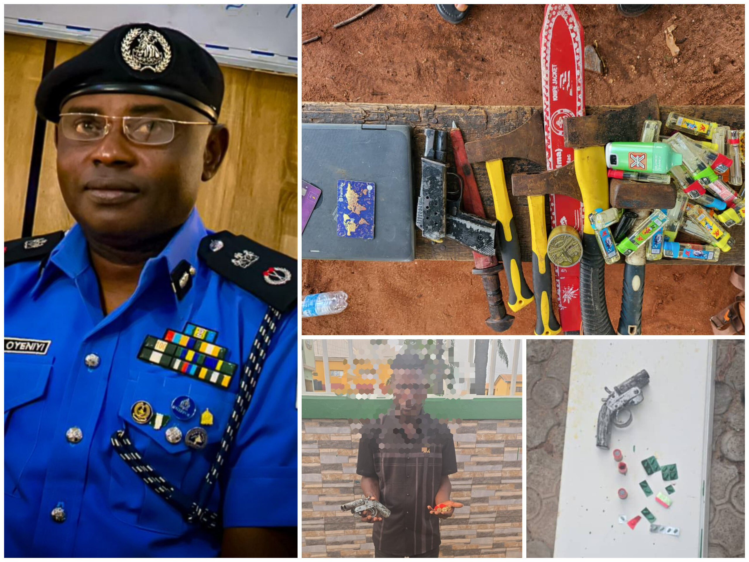 Items recovered from the scene include an English-made Beretta pistol loaded with one round of live ammunition, three battle axes, one hammer, one cutlass, and 39 firelighters believed to be intended for use during the initiation process.