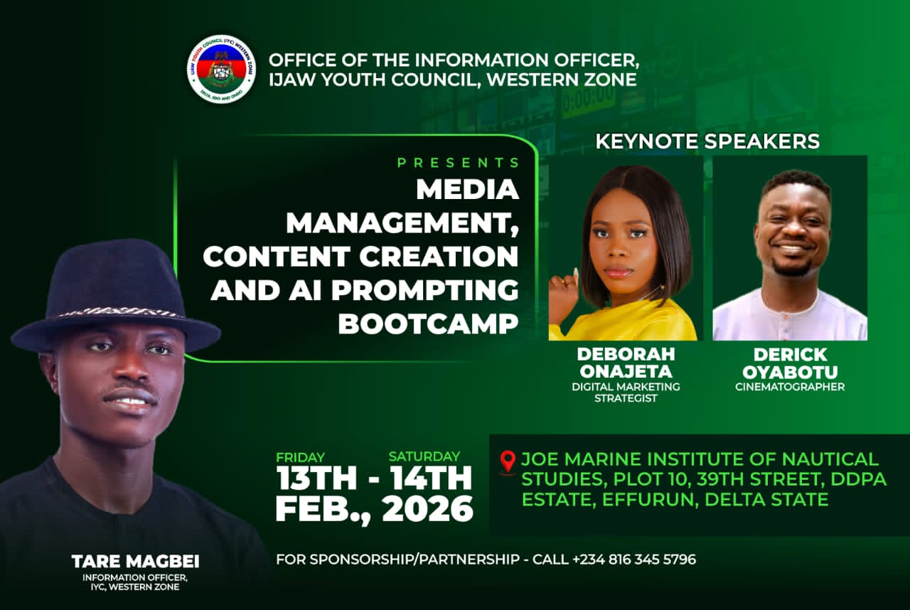 The Ijaw Youth Council, IYC, Western Zone Information Officer Comrade Tare Magbei, has scheduled a two-day digital skills bootcamp training which is aimed at equipping Ijaw youths with practical media and technology competencies.
