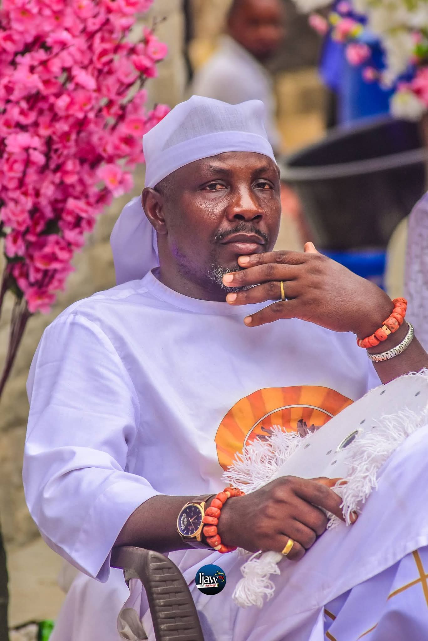 In the Gbaraun Egbesu Temple the traditional percussionists and the singers played roles relevant to the execution of their cabalistic tasks. There was a talented harmony and symphony in the order the beaten drums and songs were engaged. The Chief Opuozi drummer, with a skillful exploitation of his left heel on the drum followed by calculated raising of the drumsticks, attuned to the antiphonies of the singers, Tompolo suddenly appeared on the dancing arena between the two processions of dancers attired in pure white clothes. Holding a white fan that sporadically did some imaginary fanning directed to himself, Tompolo began to nod his head here and there, though accurately to the directional language of the drum. After a spell of captivating communication between the two, Tompolo smartly disappeared into the temple to do some ablutions for people. The moment of communication between the Chief percussionist and Tompolo was a memorable spectacle as he (Tompolo) waa seen dancing gracefully with calculated dignified steps effortlessly changed here and there without any clash with the drumming and the rising antiphonies.